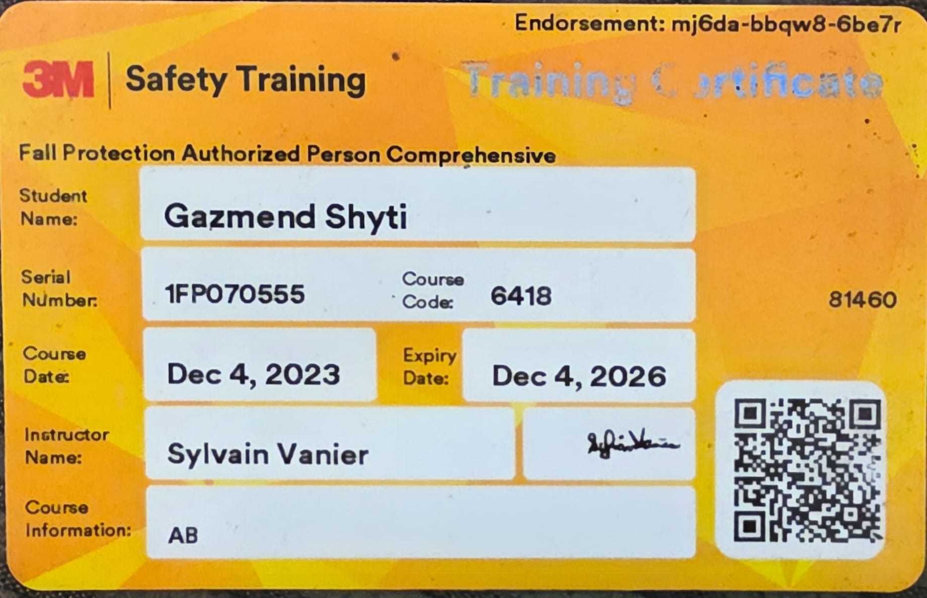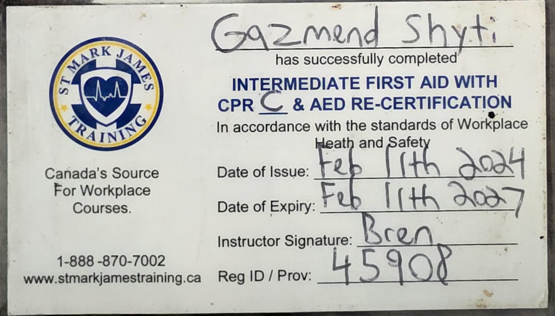 Safety is non-negotiable at Vertex Roofing. Gazi holds current certifications in Fall Protection Authorized Person Comprehensive (3M Safety Training, valid through December 2026) and Intermediate First Aid with CPR C & AED Re-Certification (St. Mark James Training, valid through February 2027). Our team is fully covered by the Workers’ Compensation Board of Alberta (WCB Account #7658821, Industry Code 42118) with both worker and personal coverage, and we carry comprehensive liability insurance (Policy #00387194C01).